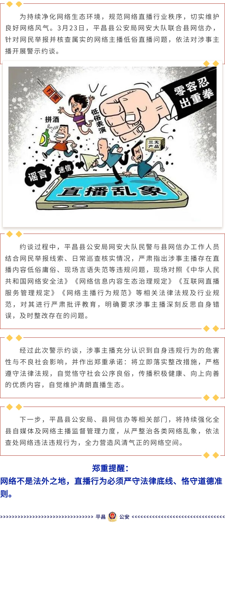 平昌公安约谈违规主播!重拳整治网络乱象,守护清朗网络空间